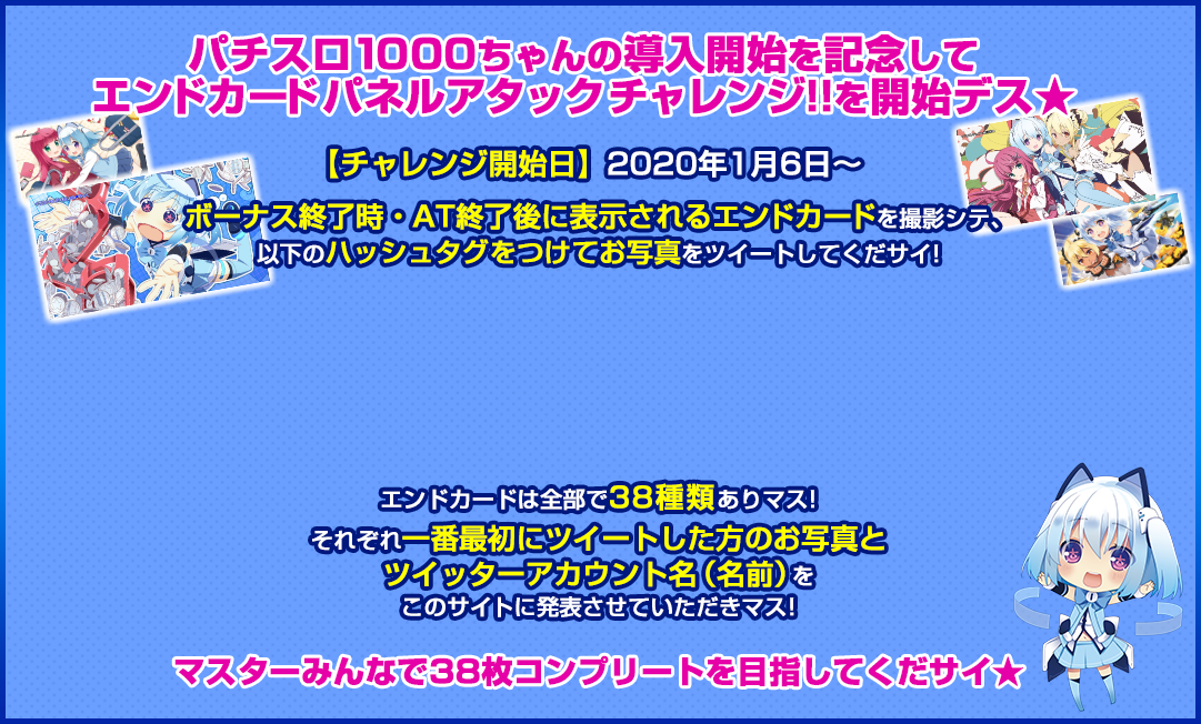 ※ハッシュタグ「#パチスロ1000ちゃん #1000ちゃんパネルアタックチャレンジ」をつけてツイートされた写真とツイッターアカウント名が当サイトに表示される可能性があります。予めご了承ください。